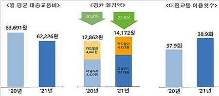 이는 이용자들이 월 12,862원(마일리지 적립 8,420원, 카드할인 4,442원) 혜택을 받아 대중교통비의 20.2%를 절감하였던 ‘20년에 비해 교통비 절감률이 높아진 것이다.