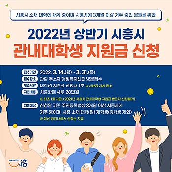 지난해 처음 시행한 관내 대학생 지원금은 시흥시 소재 대학(원)에 재학 중이며 주민등록법상 시흥시에 3개월 이상 거주 중인 대학생(대학원생)이면 누구나 신청할 수 있다.