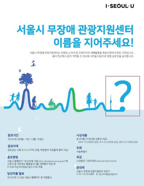 서울시가 5월 28일(월)부터 6월 11일(월)까지 장애인, 노약자 등 관광약자의 여행활동을 종합 지원하는 ‘서울시무장애관광지원센터’의 명칭을 시민공모를 통해 모집한다고 밝혔다.