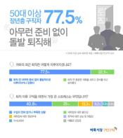 미디어윌(대표 장영보)이 운영하는 벼룩시장구인구직이 50대 이상 장년층 구직자 480명을 대상으로 설문조사를 진행한 결과, 77.5%가 최근에 이루어진 퇴직은 ‘아무런 준비 없이 돌발적으로 이루어지거나 당했다’고 답했다. 반면 ‘퇴직 전 충분한 계획을 하고 퇴직했다’고 답한 응답자는 25.5%에 불과했다.
