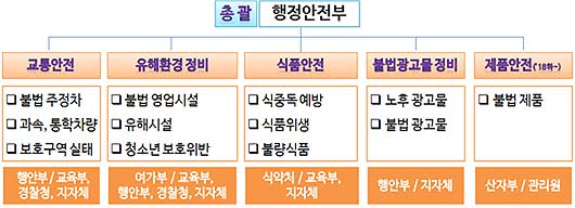 이번 점검은 2월 25일부터 3월 22일까지 4주간 실시하며 특히, 전국의 6,000여개 초등학교 주변의 교통안전, 유해환경, 식품안전, 제품안전, 불법광고물 등 안전 관리가 취약한 5개 분야에 대해 집중적으로 점검할 계획이다.