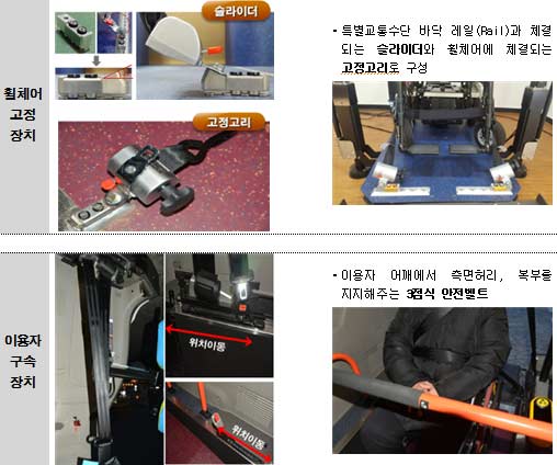 * 휠체어 탑승공간 규격(750mm×1,300mm), 휠체어 고정장치 및 탑승객 안전띠, 머리 지지대, 등받이 등의 기준 및 강도 시험방법 등 규정