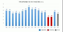 17개 광역단체장 중 더불어민주당이 우세를 보이는 곳은 14곳이며, 자유한국당은 대구와 경북 등 두곳에서만 우위를 보이는 것으로 나타났다. 제주는 무소속으로 출마한 원희룡 후보가 우위를 유지하고 있다. 다만, 대구와 경북의 경우 지지율 격차가 크지 않고 부동층 비중이 높아 판세변화 가능성이 존재한다. 대구는 1위와 2위간 격차가 불과 1.9%p 밖에 나지 않고 있으며, 경북 역시 1위와 2위간 격차가 7.6%p로 크지 않은 것으로 나타났다.