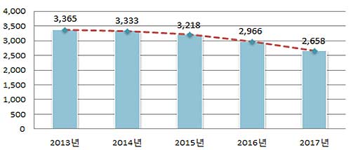 도로교통공단 통계에 따르면, 최근 5년간(’13~’17년) 초등학생 보행자 교통사고 발생건수는 감소추세이나 여전히 많은 15,540건이 발생했다.