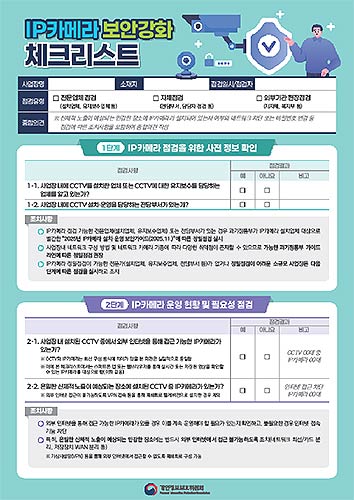 이에 개인정보위는 소규모 사업장 등에서 이행할 수 있는 ‘IP카메라 점검 체크리스트’를 마련한다. 또한, 관계부처(문화체육관광부, 보건복지부 등), 지방자치단체, 주요 직능단체 등과 협력하여 공공시설물, 의료기관, 소규모 사업장(헬스장, 노래방 등) 등에 대한 IP카메라 자율점검 및 보안조치 이행을 적극 추진한다.
