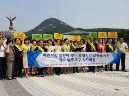 김용희 회장은 “3월 근로기준법 개정에 따라 보육을 포함한 사회복지사업이 휴게시간 특례업종에서 제외됨에 따라 7월 1일부터 보육교사의 근무시간 중 휴게시간사용의 의무화되었으나, 보육교사 휴게시간 적용을 위해 정부가 6월 22일 발표 한 대책은 보육교사가 제대로 된 휴게시간을 갖기에는 미흡하고, 현장적용에 문제가 있음을 인식하여 어린이집 특성에 맞는 휴게시간 보장을 위한 정부 대책을 촉구한다”고 밝혔다.