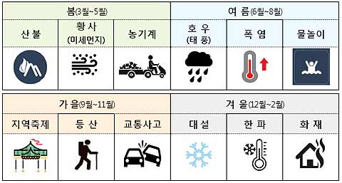 (겨울, 12월~2월) 겨울은 찬 대륙성 고기압의 영향으로 인한 대설과 한파, 난방기 사용 증가로 인한 화재 발생에 주의해야 한다.