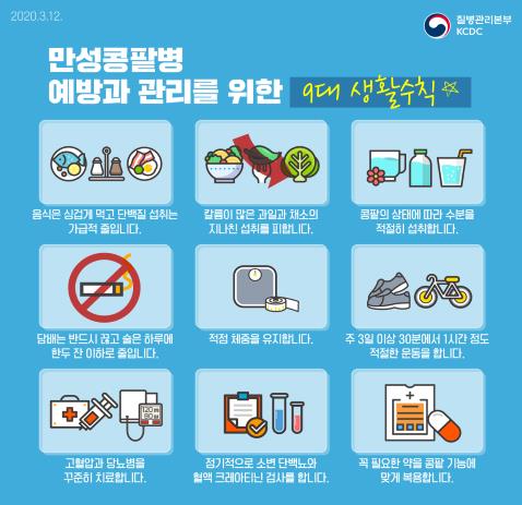 질병관리본부(정은경 본부장)는 3월 12일(목) ‘세계 콩팥의 날’*을 맞이하여 만성콩팥병 예방과 관리를 위해 지속적인 운동과 식이조절 등 9대 생활 수칙 실천과 의심증상이 있는 경우 조기진료를 당부하였다.