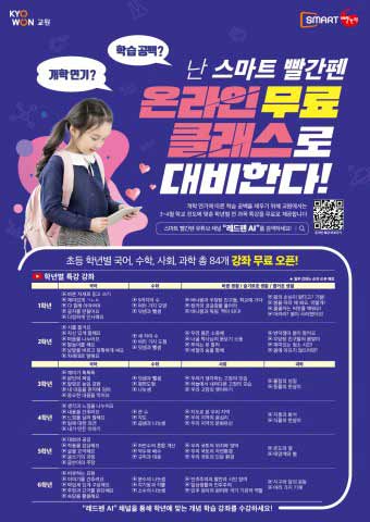 교원의 36년 교육 노하우를 담은 무료 강좌를 통해 초등학생들이 쉽고 즐겁게 교과 학습을 보충하고 부모의 학습 부담감을 줄여주고자 한다”며 “이번 코로나19 사태로 에듀테크가 필수인 시대가 됐다. 온라인 강좌, 화상 수업 등 비대면 학습을 피할 수 없는 상황에서 에듀테크 리더로서 양질의 디지털 콘텐츠를 통해 자녀들이 ‘올바른 에듀테크 학습 습관’을 형성할 수 있길 희망한다”고 말했다.