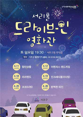 서울 서초구(구청장 조은희)가 코로나19 장기화로 지친 서초구민을 위해 11일부터 매주 토요일, 일요일 구청 주차장에서 '서리풀 드라이브 인(Drive-in) 영화관(자동차 극장)'을 운영한다.