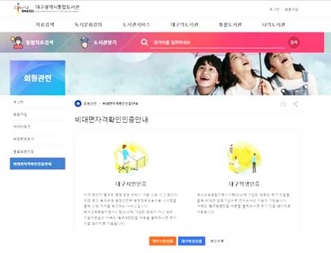 대구시는 코로나19 확산으로 도서관 임시 휴관이 길어짐에 따라 시민들이 사회적 거리 두기를 실천하면서 집에서 공공도서관 서비스를 이용할 수 있도록 '도서관 회원 비대면 자격 확인 서비스'를 시행하고 있다.