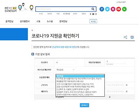 이 서비스를 통해 강남구민 등 서울시민 누구나 가구 정보와 소득 사항 등을 입력하면 ▲국가 한시생계지원금 ▲국가긴급재난지원금 ▲아동돌봄쿠폰 ▲서울시 재난긴급생활비 예상급여액과 중복지원 여부, 부적합 사유 등을 한눈에 확인할 수 있다.