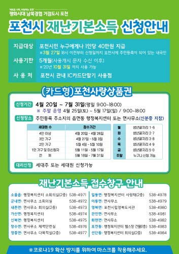 경기도 포천시는 코로나19로 어려운 시민들의 생활고를 조금이라도 해소하고자 1인당 40만원씩 포천시 재난 기본소득을 20일부터 신청받고 있다.