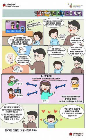 ‘청각장애인의 의사소통 방법(강윤민 교사)’, ‘발달장애를 가진 친구와의 의사소통(노원희 교사)’, ‘시청각장애인의 의사소통(백지민 교사)’, ‘장애인의 의사소통 권리(정다운 교사)’로 구성된 이번 웹툰은 유형에 따라 다르게 사용하는 다양한 의사소통 방법과 그 권리에 대해 쉽게 설명하여 장애에 대한 이해를 돕는다.