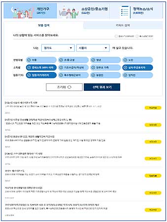 개인은 가구특성, 소득수준, 직종 등 여러 검색조건을 선택하여 현금, 서비스이용권, 요금 감면 및 융자 지원 등 다양한 혜택정보와 혜택을 받기 위한 지원대상, 신청방법 등을 안내받게 된다.