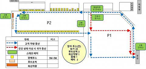 소비자가 차량을 타고 장터 입구에 도착하면 코로나19 예방을 위해 안전요원이 탑승자의 체온을 측정한다. 이상이 없는 경우만 진입을 허용하며 농가별 판매상품, 천막위치, 가격 등이 포함된 주문서를 받아볼 수 있다.