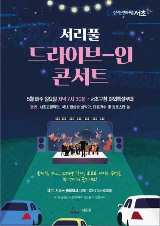 서초구(구청장 조은희)는 오는 5월 3일부터 5월 말까지 매주 일요일 저녁 7시 반 서초구청 야외 특설무대에서 차 안에서 즐기는 신개념 라이브 공연 '서리풀 드라이브인 콘서트'를 개최한다고 밝혔다.