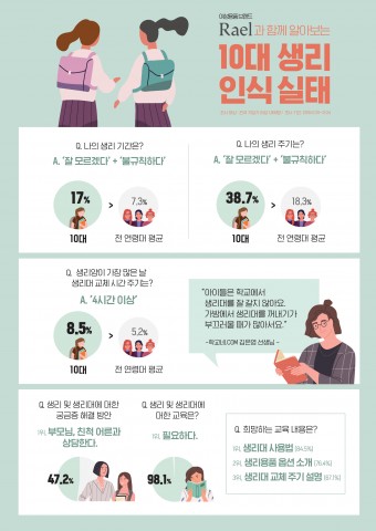 전문 리서치 기관 ‘글로벌 리서치’와 라엘이 국내 가임기 여성 1000명을 대상으로 진행한 생리 실태 조사 결과에 따르면 본인의 생리 기간을 잘 모르거나 불규칙하다고 응답한 10대는 17%로 전체 응답자 평균인 7.3%보다 2배 이상 높았다. 생리 주기에 대해 묻는 질문에서도 잘 모르거나 불규칙하다고 응답한 10대는 38.7%로 전체 평균 18.3%보다 2배 이상 높게 나오면서 여성 청소년들의 생리 지식이 전반적으로 낮은 수준으로 확인됐다.
