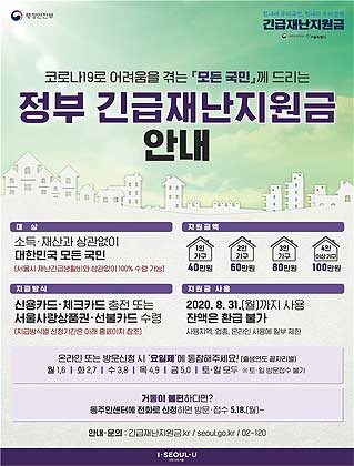 서울시는 ‘정부 긴급재난지원금’ 신청을 앞두고 다양한 신청방법과 절차, 사용시 유의사항, ‘서울시 재난긴급생활비’와의 중복지급 여부 등 지급계획을 자세히 안내했다.