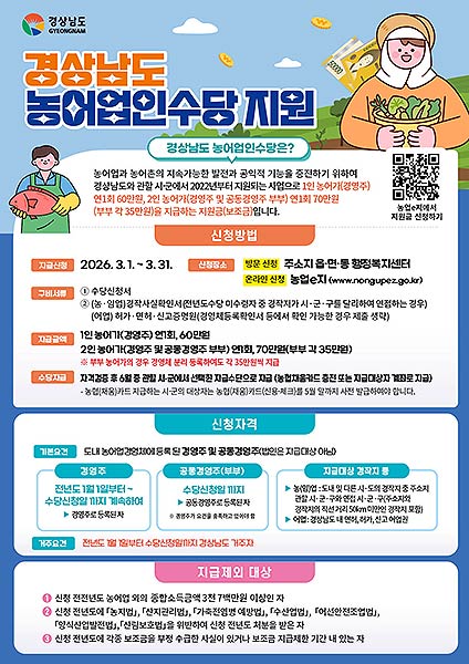 경남도, 농어업인수당 60~70만 원으로 2배 껑충!! 3월 한 달간 신청