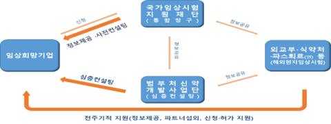 외교부(현지 공관), 식품의약품안전처(한국국제협력단), 과학기술정보통신부(파스퇴르연구소) 등 민관 협력을 통해 기업의 해외 현지 임상시험을 지원하고, 임상시험이 조기에 승인받을 수 있도록 현지 규제 기관과의 협력체계도 강화할 계획이다.