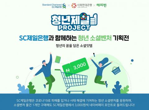사회연대은행과 SC제일은행은 코로나19로 경영애로를 겪는 청년 소셜벤처의 비대면 판로 지원을 위해 30일까지 네이버 온라인 기부포털 ‘해피빈’에서 ‘SC제일은행과 함께하는 청년 소셜벤처 기획전’을 진행한다.