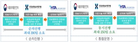 통합심사 신청 시 ① 의료기기 허가(식약처), ② 급여·비급여 대상 여부(건강보험심사평가원) 및 ③ 신의료기술평가(보건의료연구원)의 심사가 동시에 진행된다.