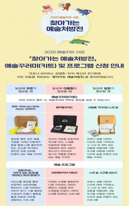 ‘찾아가는 예술처방전’의 일정, 신청방법 등 더욱 자세한 내용은 교육진흥원 공식 누리집(www.arte.or.kr)에서 확인할 수 있다.