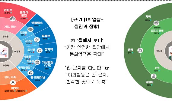 코로나19 이후 국민의 일상은 ‘집’을 중심으로 큰 변화가 나타났다. ‘집 밖’으로의 야외활동은 집 근처로 위축된 반면에, ‘집 안’에서의 문화생활은 비대면 서비스와 함께 확대됐다.