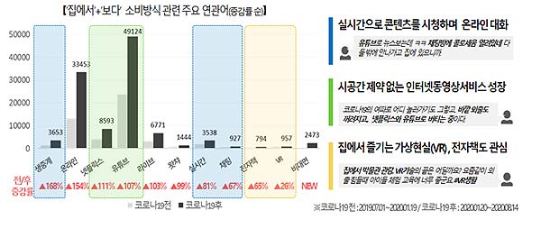 이 가운데 ‘보는 것’과 ‘다니는 것’의 언급량은 코로나19 이전(2019. 7. 1.~2020. 1. 19.) 대비 코로나19 이후(2020. 1. 20.~8. 14.) 각각 7.2%, 9% 줄었다. 하지만 ‘집에서 보다’ 관련 언급량은 23.4%, ‘집 근처를 다니다’ 관련 언급량은 23.2% 상승하면서, 코로나19 발생 이후 국민의 일상이 ‘집’을 중심으로 큰 변화가 나타났음을 보여줬다.