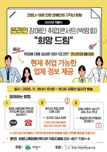 경기 의왕시(시장 김상돈)는 오는 18일 희망나래장애인복지관 주관으로 코로나19로 인해 취업 사각지대에 놓인 구직장애인을 위한 '희망드림'온라인 장애인 취업콘서트를 개최한다.