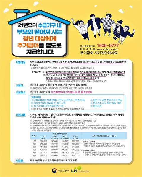 국토교통부(장관 김현미)는 내년부터 청년 주거급여 분리지급(이하 “청년 분리지급“)을 시행하고 12월1일부터 사전신청을 받는다고 밝혔다.