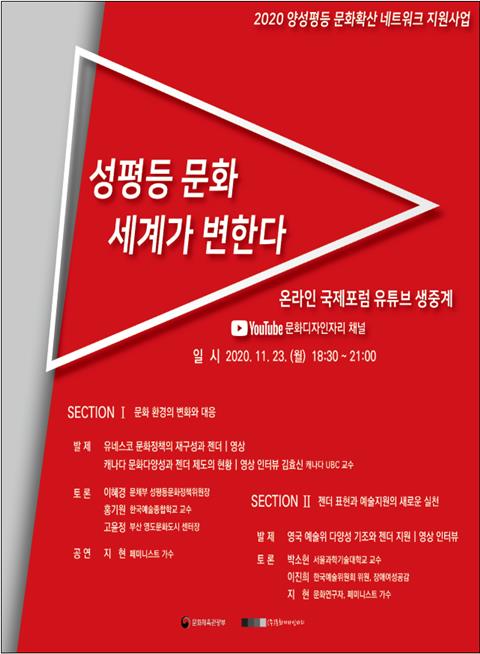 문화체육관광부(장관 박양우, 이하 문체부)는 문화디자인자리(대표 최혜자)와 함께 11월 23일(월) 오후 6시 30분 양성평등 문화 확산을 위한 온라인 국제 토론회 ‘성평등 문화, 세계가 변한다’를 개최하고 유튜브를 통해 생중계한다.
