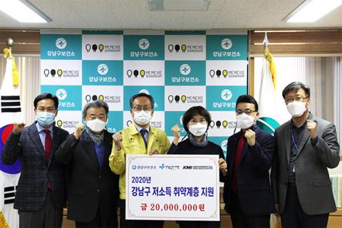 18일 강남구보건소에서 열린 기부금 전달식에는 강남구보건소 양오승 소장과 황관웅 보건행정팀 과장, KMI한국의학연구소 김순이 이사장, 한만진 사회공헌사업단장, 이재영 전무이사, 김대진 강남검진센터장 등 관계자들이 참석했다.