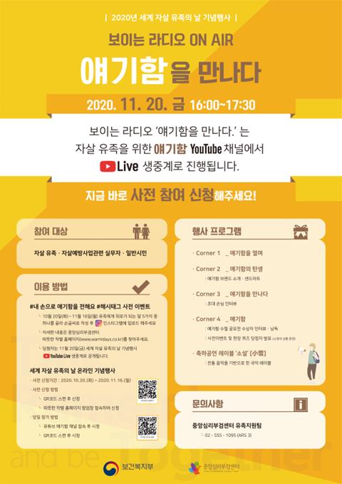 보건복지부(장관 박능후)와 중앙심리부검센터(센터장 전홍진)는 ‘세계 자살 유족의 날’을 맞아 11월 20일(금), 오후 4시 온라인 생중계(드림씨어터 스튜디오, 서울시 강남구 소재)로「2020년 세계 자살 유족의 날 기념행사 보이는 라디오‘얘기함(얘기해요. 기억해요. 함께해요)을 만나다’」를 개최하였다고 밝혔다.