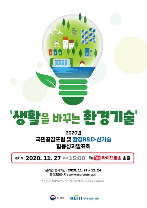 환경부(장관 조명래)는 우수한 환경기술을 널리 알리고, 환경기술의 발전과 보급을 촉진하기 위해 11월 27일부터 12월 24일까지 '2020 국민공감공개토론회(포럼) 및 환경연구개발(R&D)·신기술 합동성과발표회'를 개최한다.