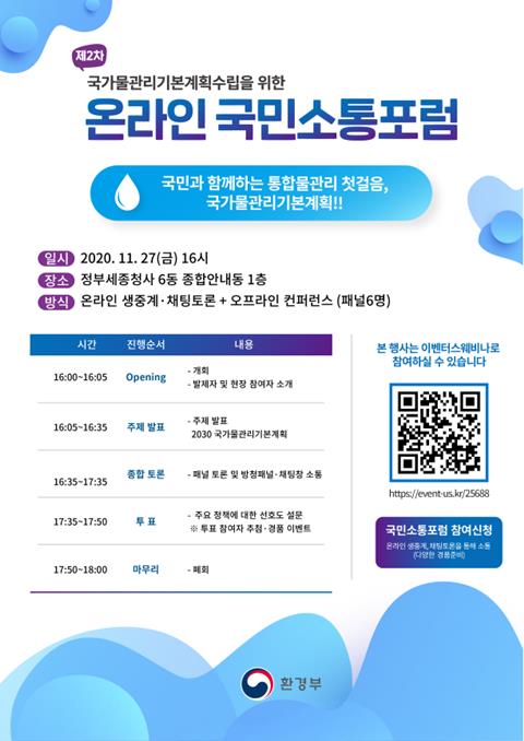 환경부(장관 조명래)는 11월 27일 오후 4시부터 2시간 동안 '국민과 함께하는 통합물관리의 첫걸음! 국가물관리기본계획'을 주제로 국민과 전문가들이 실시간으로 소통하는 '제2차 온라인 국민소통포럼'을 개최한다.
