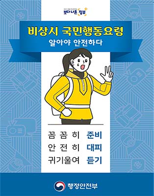 행정안전부(장관 진영)는 비상시 국민들이 안전하게 대피할 수 있도록 행동요령을 담은 리플릿과 소책자를 제작하여 전국 시·도 및 시·도 교육청 등에 배포한다고 밝혔다.