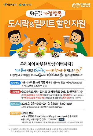 서울시 ‘퇴근길 가정행복 도시락・밀키트 할인지원’ 사업’은 「엄마아빠 행복프로젝트」의 하나로, 엄마아빠가 퇴근 후 아이와 더 많은 시간을 보내도록 도시락, 밀키트 등을 20% 할인된 가격에 살 수 있게 지원하는 사업이다. 작년 10월 ㈜GS리테일과 함께 사업 개시 이후 이틀 만에 신청 마감한 바 있다.