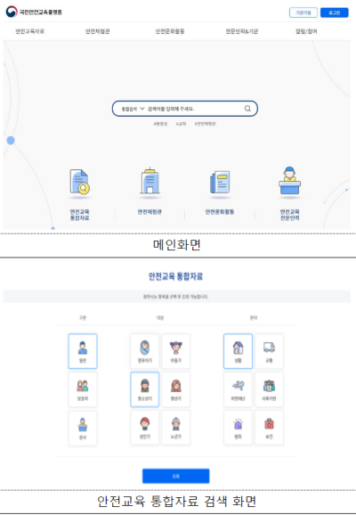 플랫폼은 ▴안전교육 통합자료 ▴안전체험관 ▴안전문화활동 ▴안전교육 전문인력 4가지 범주로 찾아보기 쉽게 설계되었으며 주요 개편 내용은 다음과 같다.