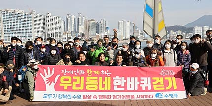 부산광역시 수영구(구청장 강성태)는 24일 관내 등록 장애인 등 50여 명이 참여한 가운데 수영구청과 ㈔부산의아름다운길에서 주관하는 '장애인과 함께하는 우리동네 한바퀴 걷기' 1회차 행사를 성공적으로 마무리했다고 밝혔다.