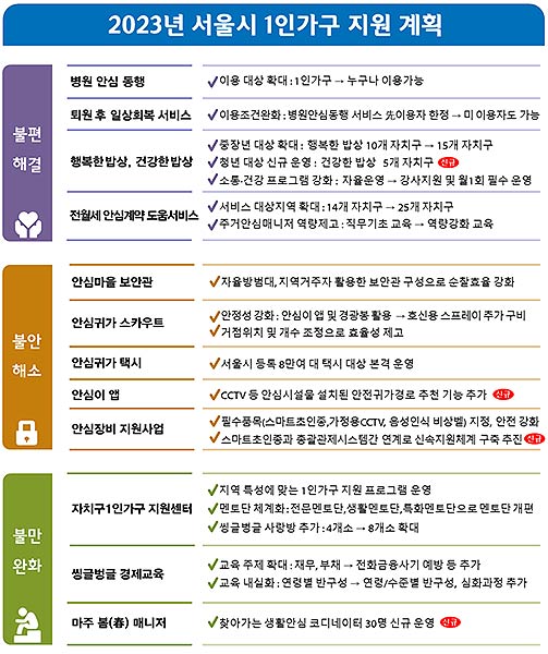 첫째, 1인가구의 생활 속 불편을 해결하기 위해 병원 안심동행서비스, 행복한 밥상, 전월세 안심계약 도움서비스 같은 돌봄‧생활 지원서비스를 강화한다.