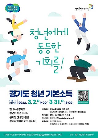 경기도가 만 24세 청년에 분기별 25만 원을 지급하는 ‘청년기본소득’ 2023년 1분기 신청접수를 3월 2일 오전 9시부터 31일 오후 6시까지 진행한다.