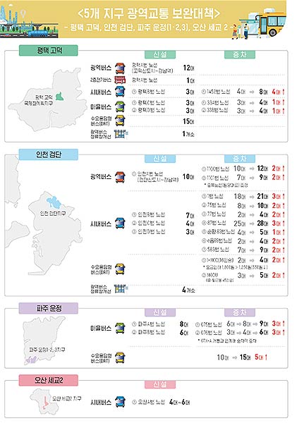 이를 위해 평택 지제역~고덕 신도시~강남역을 운행하는 광역버스 1개 노선(총 12대, 일 48회 운행)을 신설할 예정이며, 해당 노선에 대용량 운송 수단인 2층 전기버스(1대)도 투입하여, 해당 지구 내 출․퇴근 시 입석 문제 등도 지속 관리해 나갈 예정이다.
