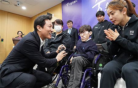• 오세훈 시장은 28일(화) 12시 서울시청에서 ‘한국의 호킹’ 민경현 씨, 무적의 서울시청 여자골볼팀, 하계패럴림픽 3연속 메달 획득한 탁구팀 워킹맘 정영아 선수, 평창패럴림픽 휠체어컬링의 4강 주역 서순석 선수 등을 격려하는 간담회를 마련했다.