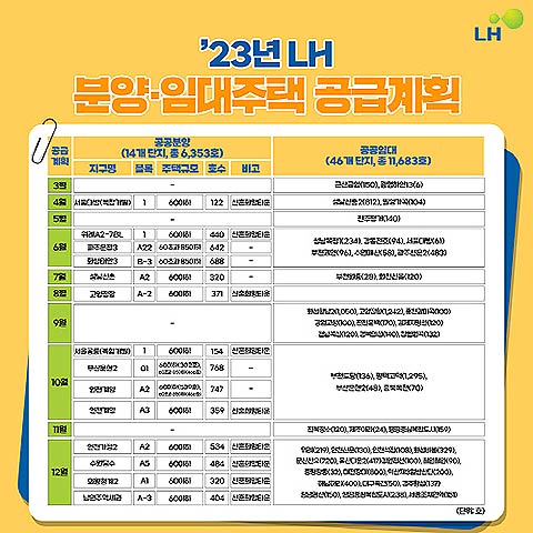 LH 관계자는 "국민들이 적기에 청약접수를 할 수 있도록 주택 건설공사 등 선행 일정을 꼼꼼히 관리하고, 마감재 개선 등으로 품질 좋은 공공주택을 공급할 수 있도록 최선을 다하겠다"고 말했다.