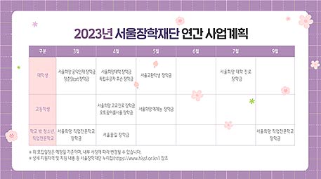 재단의 2023년 사업계획안에 따르면 올해 계획된 장학사업은 총 12개로 △서울희망대학 장학금 △서울희망 직업전문학교 장학금 △서울희망 대학 진로 장학금 △서울희망 공익인재 장학금 △독립유공자 후손 장학금 △서울교환학생 장학금 △서울희망 고교진로 장학금 △서울희망 예체능 장학금 △서울희망 하나고 장학금 △서울꿈길 장학금 △청춘Start 장학금 △오토꿈이룸서울 장학금 등이다.