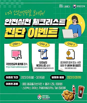 행정안전부는 국민 스스로 안전실천 역량 수준을 진단해 볼 수 있도록‘국민안전교육플랫폼(kasem.safekorea.go.kr)’을 통해 ‘안전실천 진단표(체크리스트)’(이하 ’진단표‘) 서비스를 제공하고 오늘(6일)부터 24일까지 참여 인증 이벤트를 실시한다고 밝혔다.