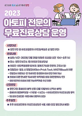 양천구(구청장 이기재)는 아토피 피부염을 앓는 성장기 아동 청소년의 조기 치료를 지원하기 위해 80명을 대상으로 연중 5회 '아토피 전문의 무료진료 상담'을 운영하고, 3월 13일 오전 9시부터 3월 참여자 16명을 선착순 모집한다고 밝혔다.