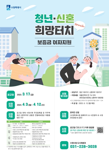 수원시가 무주택 청년·신혼부부 가구에 임차보증금 대출 이자를 지원하는 '청년·신혼 희망터치 보증금 이자지원' 사업 참여자를 4월 3일부터 12일까지 모집한다.